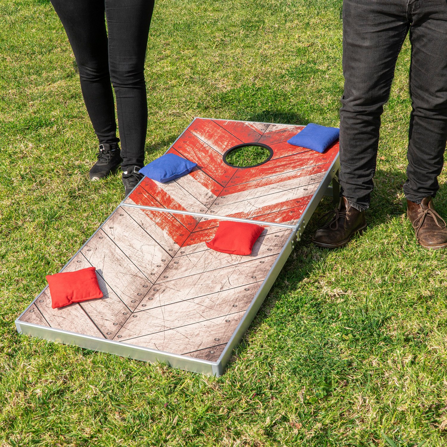 High quality and durable stitching: Comes complete with two boards and your choice of two sets of four bean bags…white, black, red or blue. Comes with 2 x 3ft*2ft boards | 8 x bean bags (4 red & 4 blue) | 1 x carry case. Eight bean bags, regulation size and weight; Each board measures 3' x 2' and includes.
