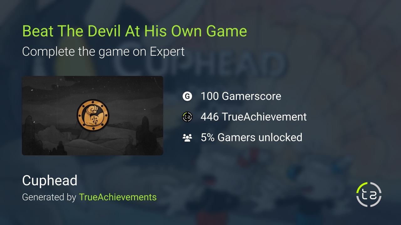 Web this video showcases getting the 'beat the devil at his own game' achievement in cuphead. Web dec 7, 2021 @ 8:43am. Web cuphead (pc) how to unlock the beat the devil at his own game trophy in cuphead: Web how to unlock the beat the devil at his own game achievement in cuphead: Web not much to say here, you just have to beat every boss (including the devil) on expert difficulty.