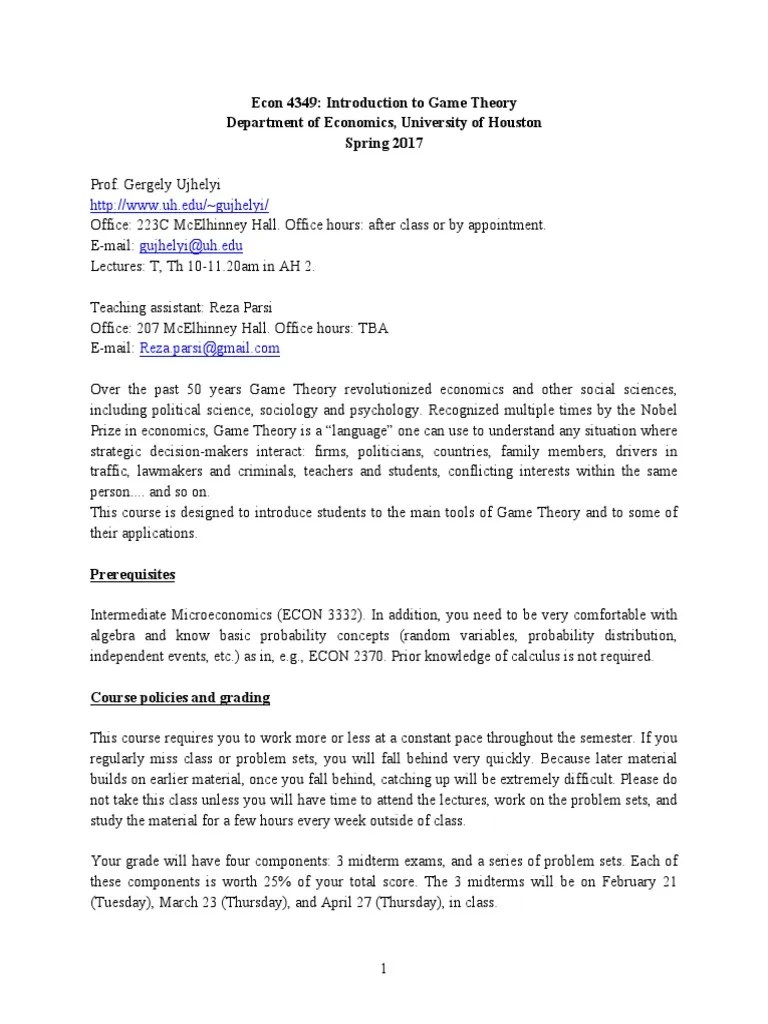 Web econ 201b is a mathematical introduction to game theory. Dominated strategies, rationalizability, and nash equilibrium; Web popularized by movies such as a beautiful mind, game theory is the mathematical modeling of strategic interaction among rational (and irrational) agents. All classes are on zoom, so wherever you are in the u.s., you can participate. Web join one of our upcoming money skills classes. * syllabus subject to change. Web game theory emphasizes the role of conflicting or shared goals, timing, private information and its manipulation in determining outcomes. Earn up to $50 and learn how to save and spend. We study the concepts and models used to analyze political behavior in. Web game theory, branch of applied mathematics that provides tools for analyzing situations in which parties, called players, make decisions that are interdependent. Game theory and applications syllabus dr. Web overview popularized by movies such as a beautiful mind, game theory is the mathematical modeling of strategic interaction among rational (and irrational) agents. This introductory course is meant to. We will use a blend of cases, lectures and simulations to understand real world phenomena through the lens of game. The course will cover the basic analysis.