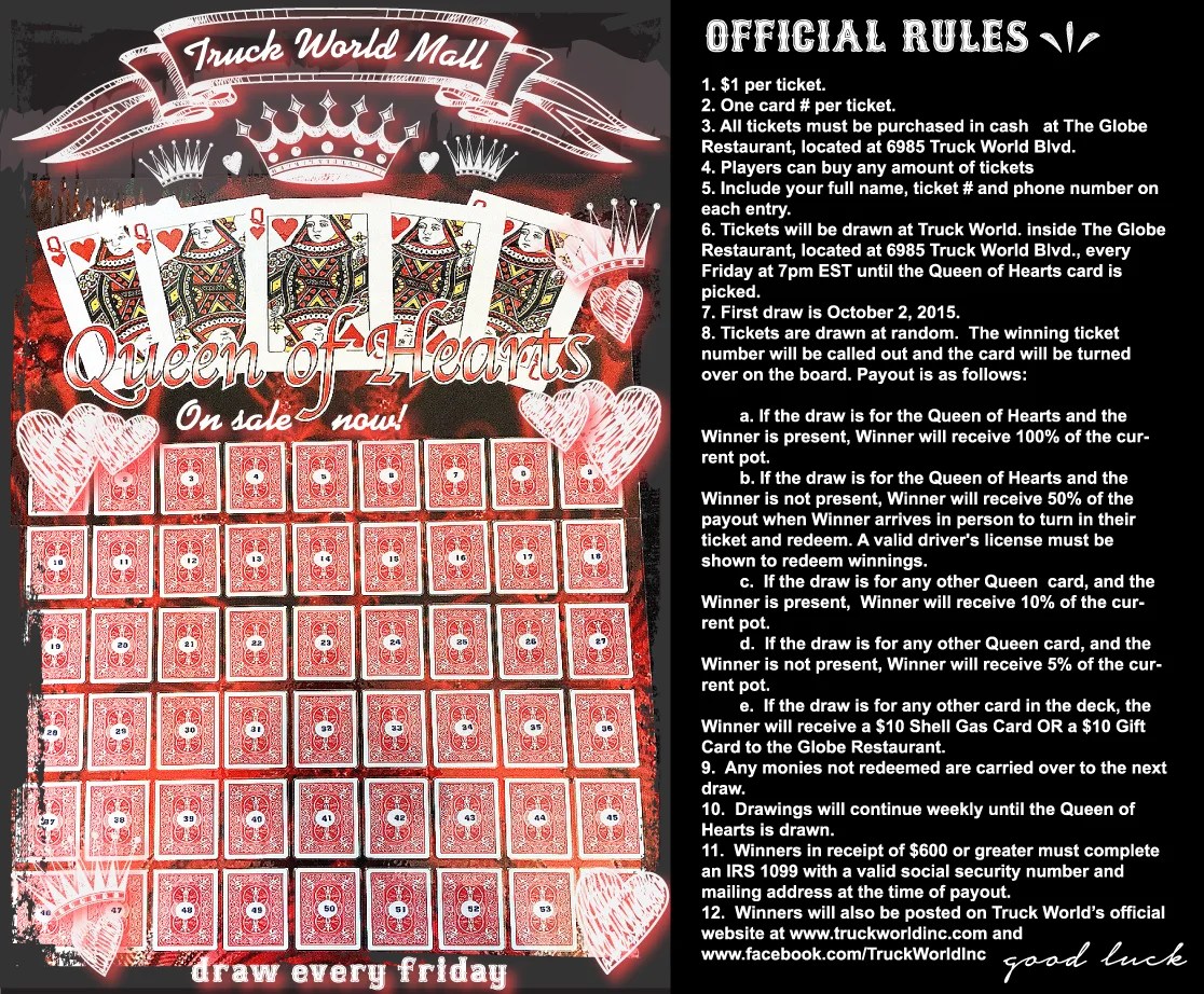 The queen of hearts raffle run by the mchenry vfw post now has a jackpot topping $7 million. Once a card is selected, it will be removed from play for the remainder of each game and will be shown face up on the board. Web what is the queen of hearts? No group tickets will be sold. To be eligible to play, you must be a current card carrying member in good standing of any american legion, sons of the american legion, american legion auxiliary or canadian legion.