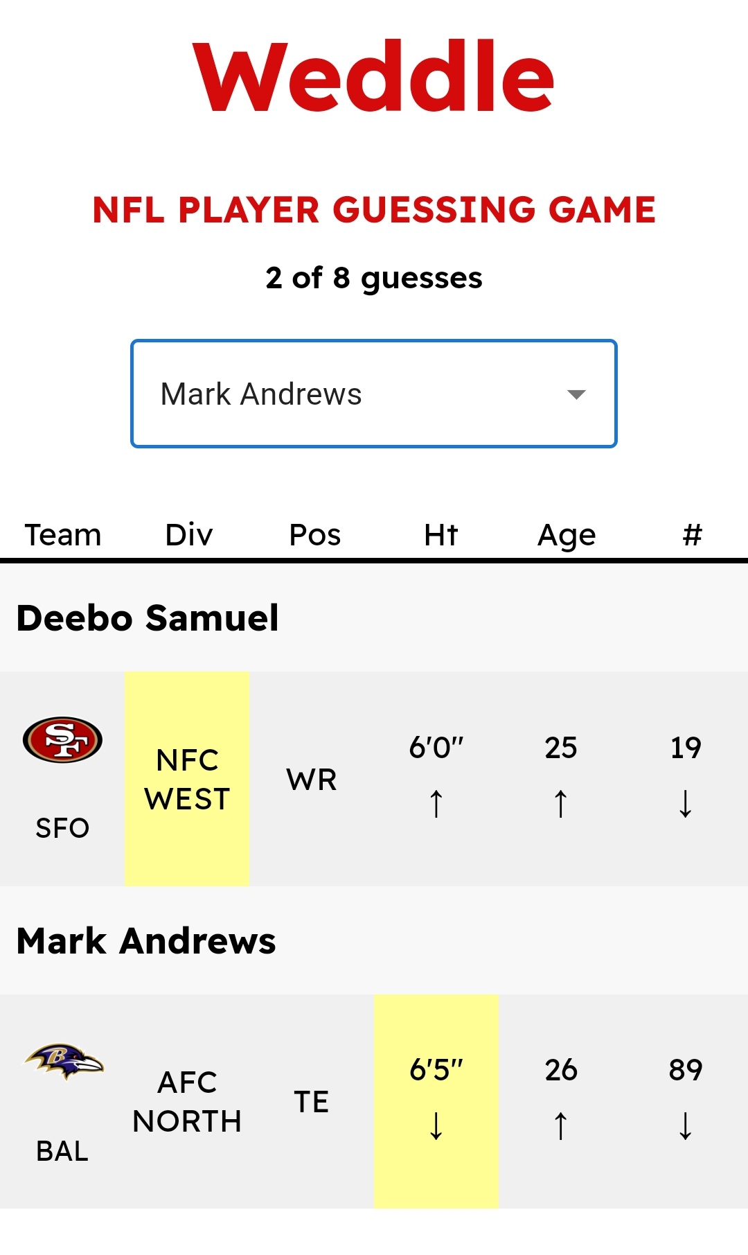 Normal mode weddle unlimited nfl player guessing game. Stats how to play ! But weddle is the nfl version of wordle. The predicted word has been identified whenever the bar turns green. Come back for a new nfl grid challenge every day!